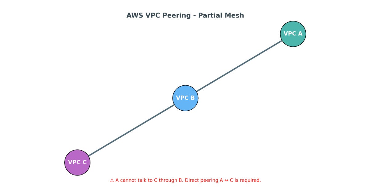 No Transitive Peering â If VPC-A is peered with VPC-B, and VPC-B is peered with VPC-C, A cannot directly talk to C.