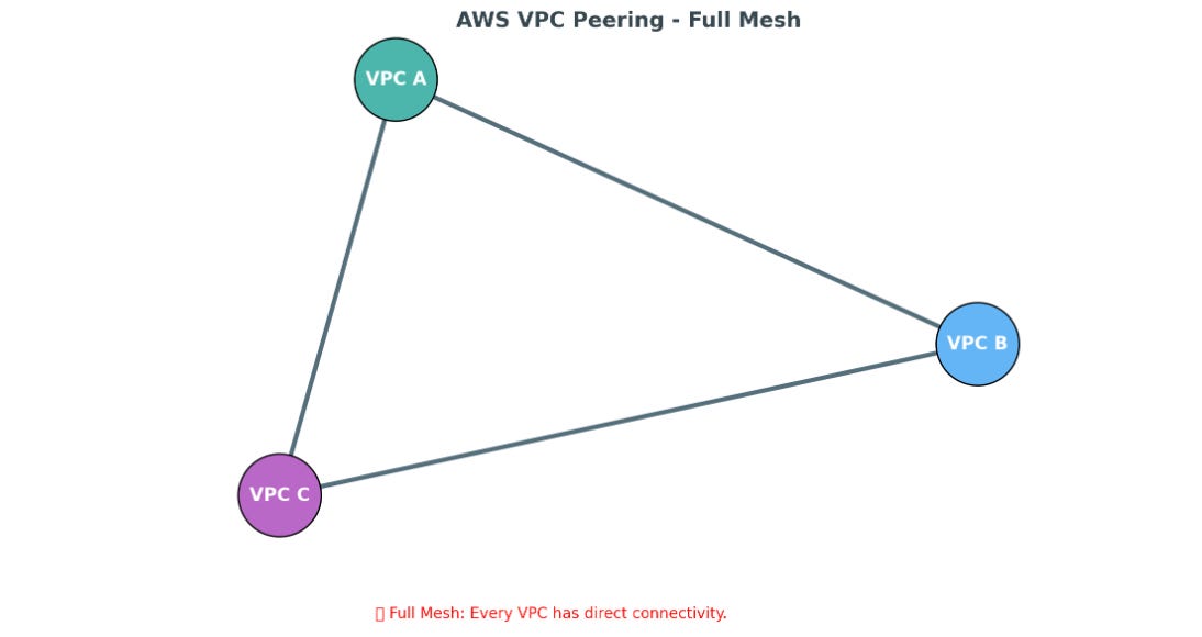Full Mesh â AâB, BâC, and AâC are all connected. Every VPC can talk directly.